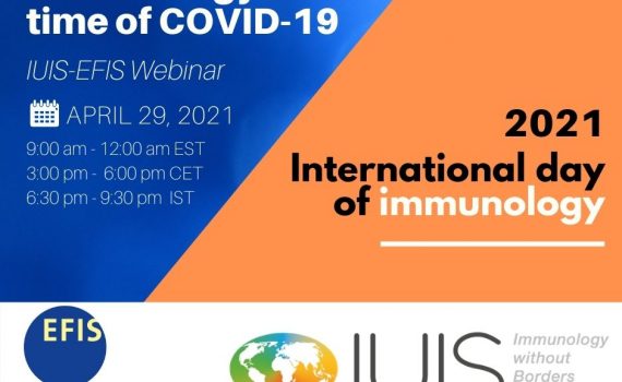 IUIS i EFIS organiziraju webinar 29.04.2021. povodom internacionalnog dana imunologije. Ove godine tema je: Imunologija u vrijeme COVID-19 (IUIS-EFIS Webinar: Immunology in the time of COVID-19: achievements, challenges and opportunities). Više informacija na linku: https://iuis.org/events/2021-international-day-of-immunology/